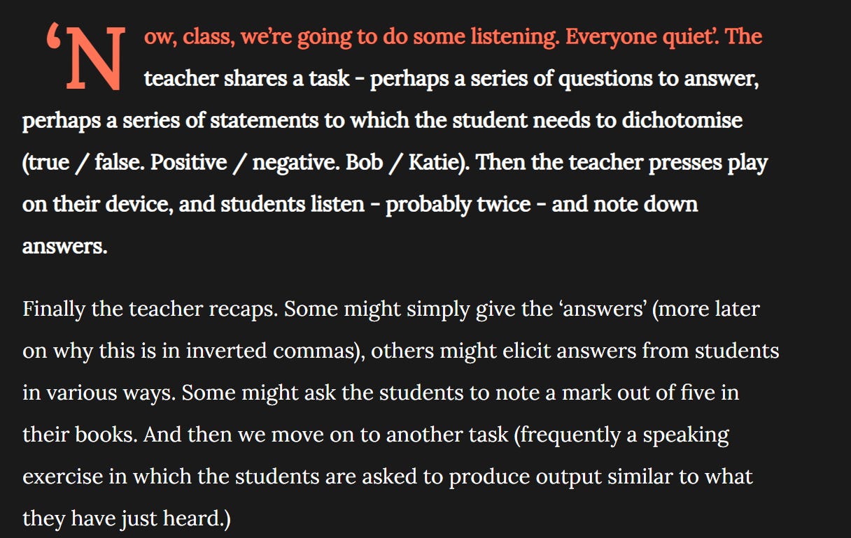 One of the things I’ve come to understand is that this was more than just a personal failing. The observers’ feedback, whilst valid, served only to accommodate (rather than address) students’ underdeveloped listening skills. My theory is that they didn’t have the expertise to help me. And that’s not a dig at them. The expertise in listening instruction was not out there. And to be truly honest, I’m not sure if it is in 2025. Teachers in my placement schools were always talking about “doing” a listening. Siegel (2014) talks about listening activities used without much consideration for their place within a learning sequence. There was never any discussion of listening as a skill to be developed. In fact, there was some research to suggest it was a passive skill which did not need to be (Rivers, 1996) (not that I was aware of this at the time).